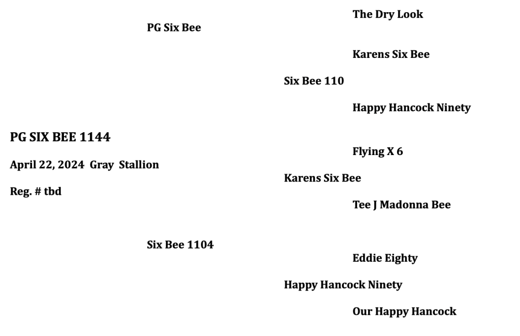 Gray Stallion. Foaled April 22, 2024. By PG Six Bee and out of Six Bee 1104.
